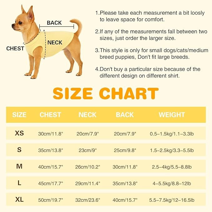 - Size Option:Our dog summer clothes designed for small dogs cats, are available in five sizes(XS/S/M/L/XL).To ensure the best fit, the recommended weight is for reference only, please measure your pet\’s chest circumference and back length before ordering.